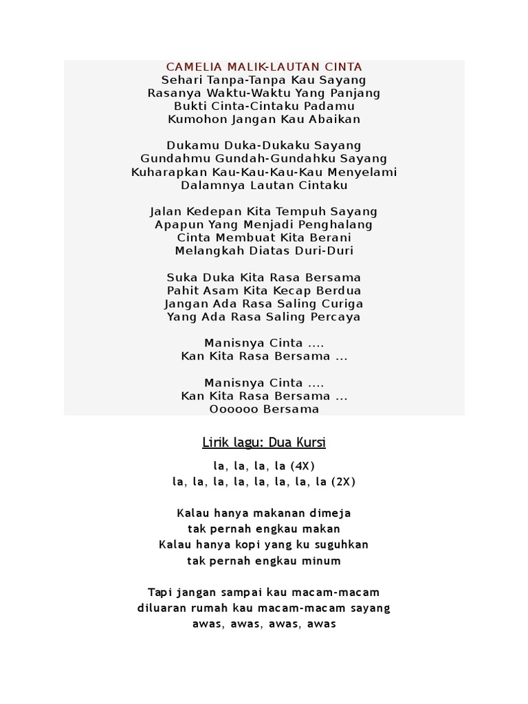 Kunyanyikan sebuah lagu Lagu sendu yang ku cipta Untuk dirimu seorang yang slalu ku puja Dirimu yang enggan bicara Ketika ku ajak bicara Resapilah lagu ini Hanyalah rinduku Aku coba berusaha memberikan yang terbaik Reff. Mengapakahoh kekasih Mengapakahjadi begini Siang malamku berdoa Moga jodohberpanjangan. B Berlalu tanpa kata.